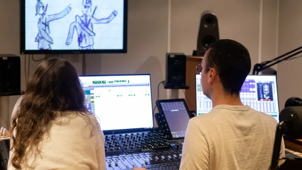 Après plusieurs mois de recherche sur la plateforme en ligne et de montage vidéo, Alicia Pifre est arrivée au dénouement de son projet et s’est ainsi rendue pour la première fois au fort d’Ivry et plus précisément dans l’un des studios d’enregistrements de l’établissement. Avec l’aide de Florian Dubois, mixeur-monteur au département de post-production à l’ECPAD, des bruitages et des passages musicaux ont été ajoutés à son court-métrage. En parallèle de son travail au sein de l’ECPAD, Florian Dubois travaille sur les projets étudiants dans le cadre de cet atelier depuis deux ans. Au-delà du matériel mis à leur disposition, il apporte aux étudiants son savoir-faire en tant que professionnel. “J’essaye de les accompagner à partir du moment où ils ont réalisé le montage en travaillant une journée complète sur le son et éventuellement leur faire des propositions selon leurs envies et idées. Le but n’est pas de transformer le projet mais de le magnifier par le son”, déclare Florian Dubois.